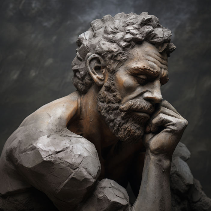 Prompt: a thinking man on a stone, head on his fist, photorealistic