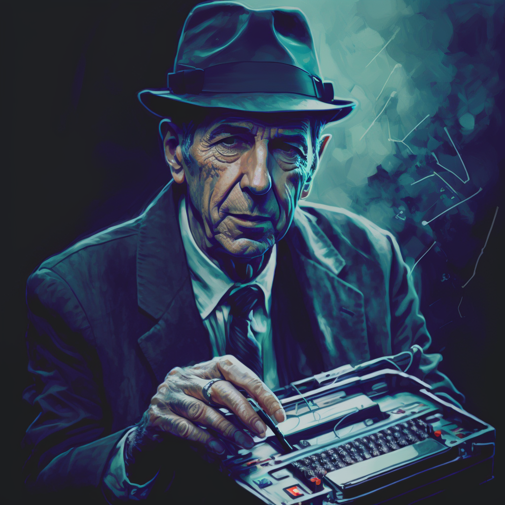 Soll das eine Zigarette sein? Und wieso hat ein Synthesizer Schreibmaschinentasten? Naja, wenigstens ist Leonard Cohen gut getroffen.