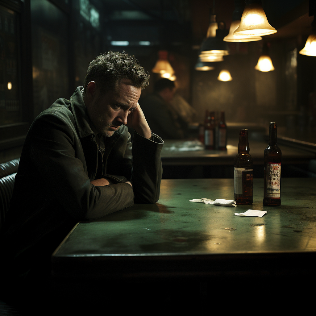 Prompt: scene from a dark movie by david fincher, showing a sad man sitting in a bar